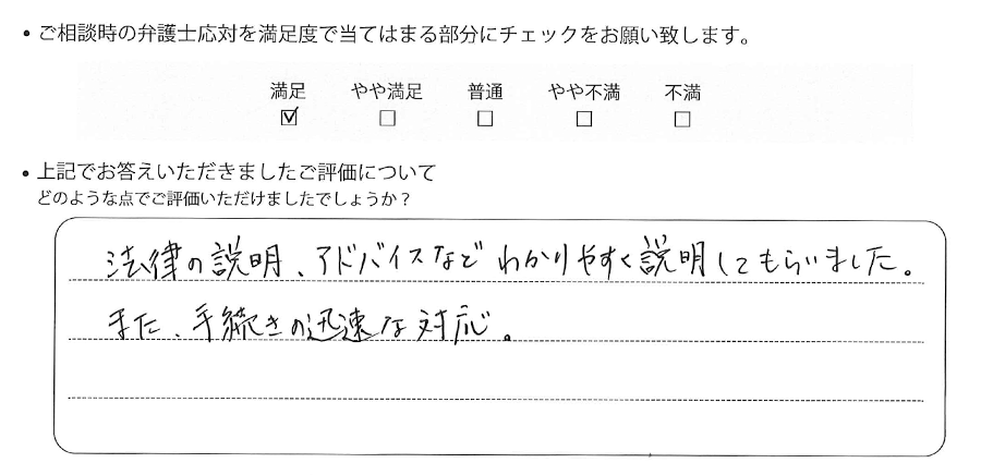 法律の説明、アドバイスなどわかりやすく説明してもらいました。また、手続きの迅速な対応。